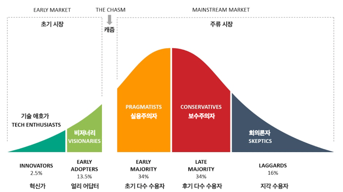 이 15%라는 숫자는 임의로 정한 것이 아닙니다. 혁신 확산 이론(Innovation Diffusion Theory)에서 말하는 Early Adopters(얼리 어답터)의 비율입니다. 혁신가(Innovators) 2.5%와 얼리 어답터 13.5%를 합친 약 15%의 사람들이 새로운 기술을 먼저 받아들이고 실제로 활용하기 시작하면, 그 다음 단계인 Early Majority(초기 다수 수용자)가 움직이기 시작합니다. 바로 이 지점이 Tipping Point입니다.