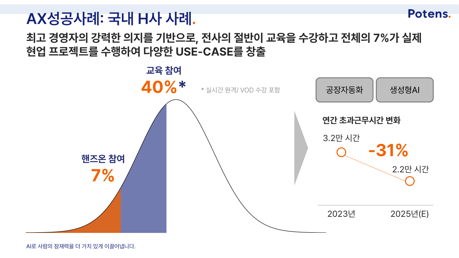 실제로 이 마일스톤을 향해 올해 적극적으로 추진한 기업이 있습니다. 국내 H사는 전사 임직원의 40% 이상이 생성형 AI 교육에 참여하도록 했고, 그중 7%가 핸즈온 과정을 통해 실제 업무 과제를 수행하며 USE-CASE를 창출했습니다. 아직 15%라는 목표에는 도달하지 못했지만, 이러한 노력의 결과는 명확하게 나타났습니다. 연간 초과근무 시간이 31% 감소한 것입니다. 2023년 3.2만 시간에서 2025년 2.2만 시간으로 줄어들었습니다.