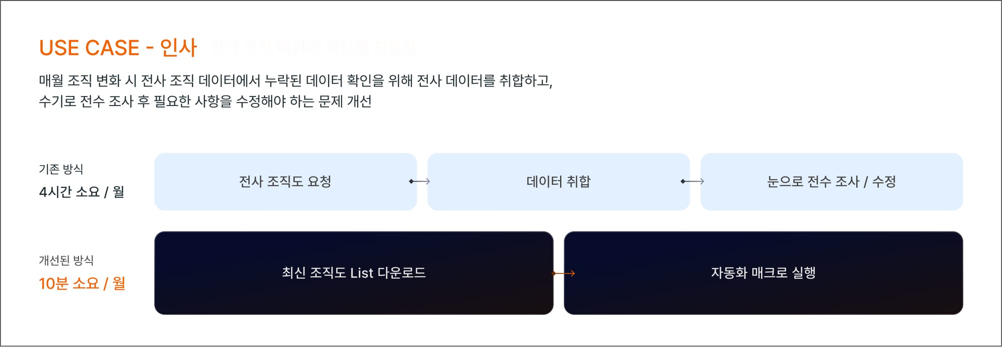 A사의 인사팀은 매월 조직개편에 따른 조직도를 갱신하고 이를 다양한 보고서와 시스템에 반영하는 데 많은 시간을 쓰고 있었습니다. 수작업 중심의 이 업무는 오류 가능성도 높고, 변경 사항 반영이 지연되는 경우도 많았습니다.