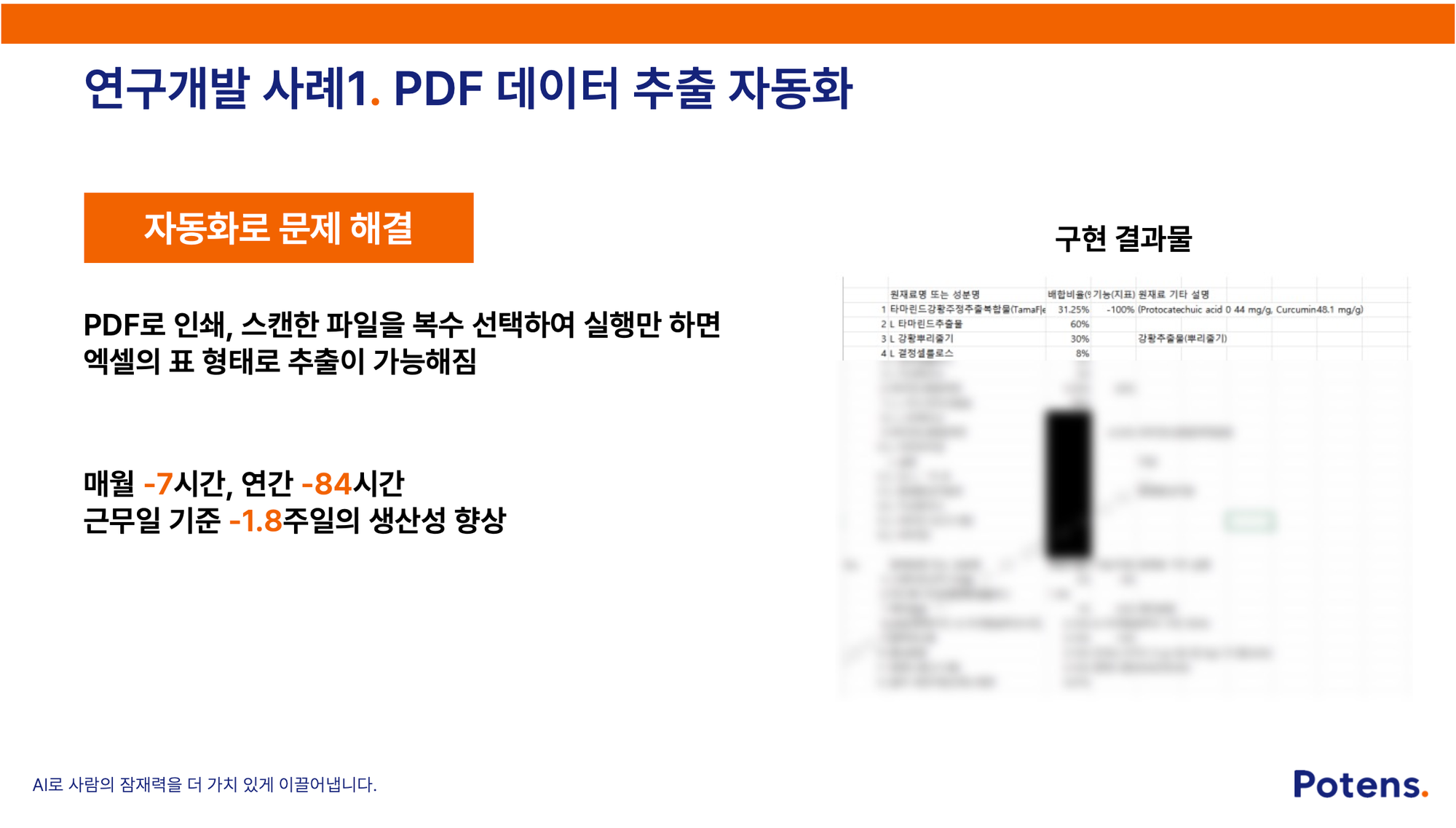 ❌ 문제 상황: 식품 원재료와 배합비 데이터를 다룰 때, 수많은 인쇄본 PDF 파일에서 필요한 부분만 골라 하나씩 Excel 표로 옮겨 적는 수작업이 이루어졌습니다. 이 방식은 자료량이 많을수록 시간이 많이 걸렸습니다.