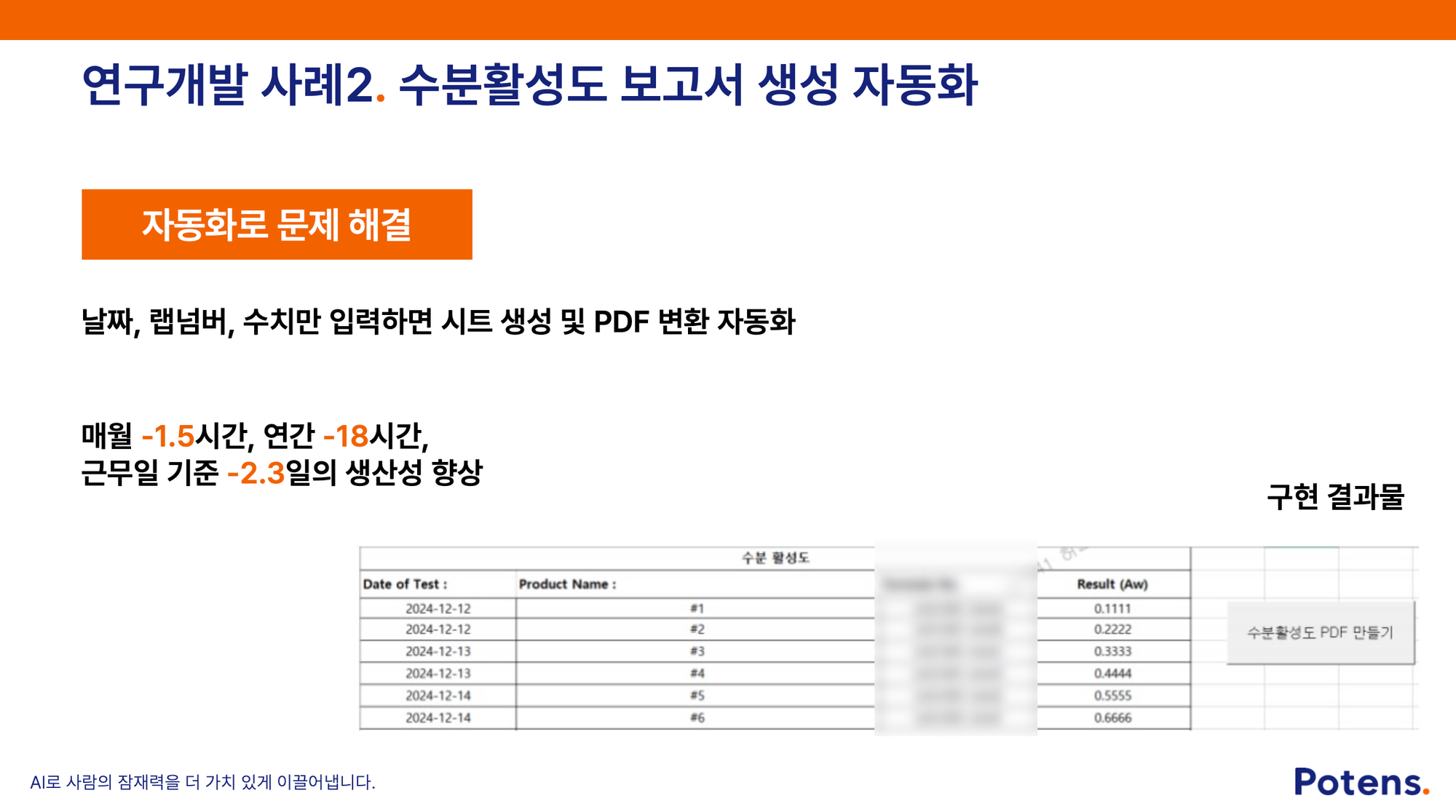 ❌ 문제 상황: 품질 실험 결과를 정리하는 수분활성도 보고서를 작성할 때, 정해진 Excel 템플릿에 날짜와 수치를 일일이 입력해야할 뿐만 아니라, 시료가 여러 개이면 한 시트를 복사해 반복 입력해야 했습니다. 그렇게 완성된 보고서를 PDF로 변환해 송부해야 했고, 이 작업들을 제품별로 반복해야 했습니다.