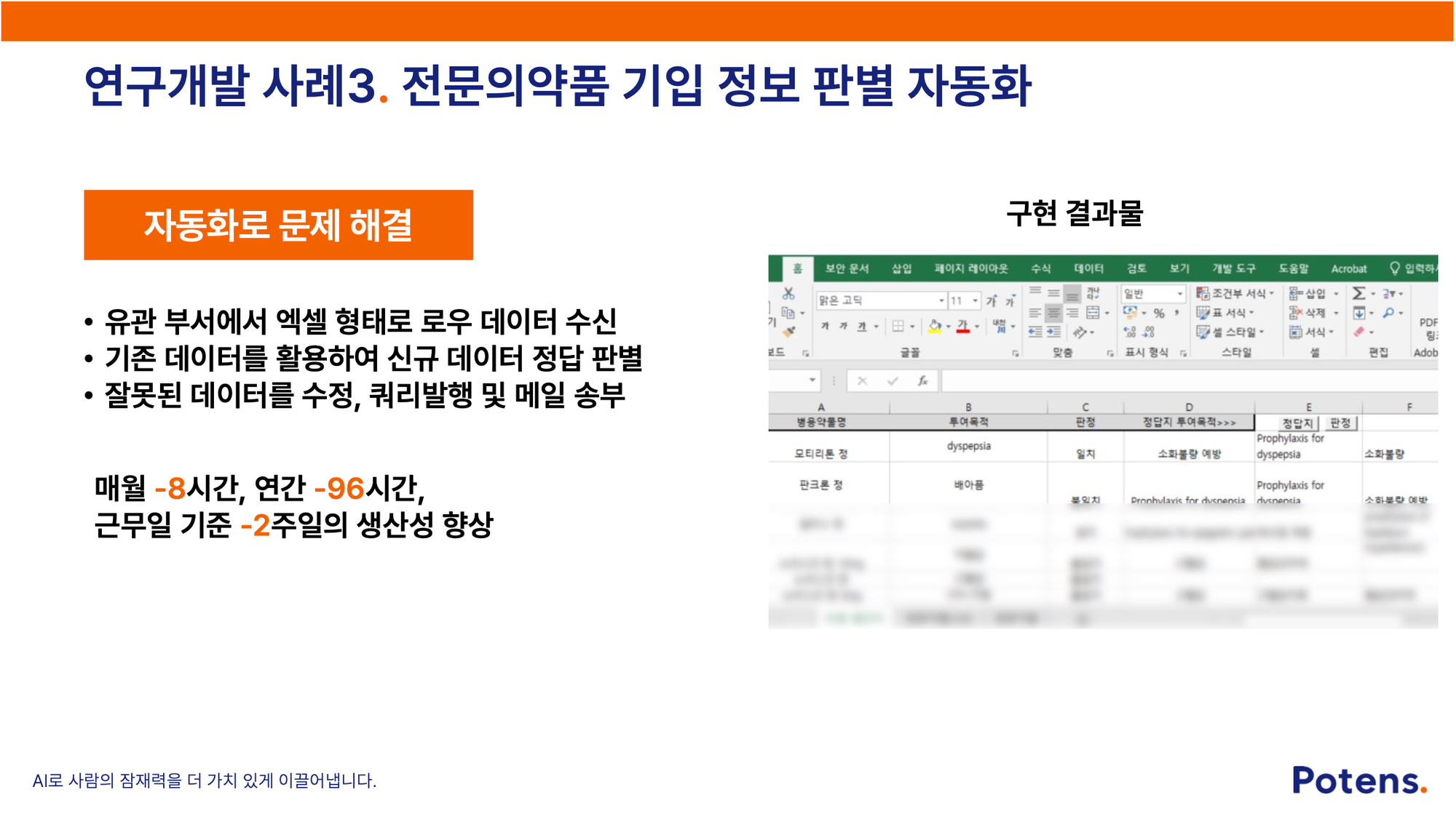 ✅ AI 적용: 생성형 AI를 활용한 자동화 솔루션을 구축하여, Excel로 전달받은 원시 데이터를 기존 데이터베이스와 대조해 입력된 전문의약품 정보를 자동 검증하고, 잘못된 경우에는 바로 수정한 뒤 담당자에게 알림까지 이루어지도록 했습니다.