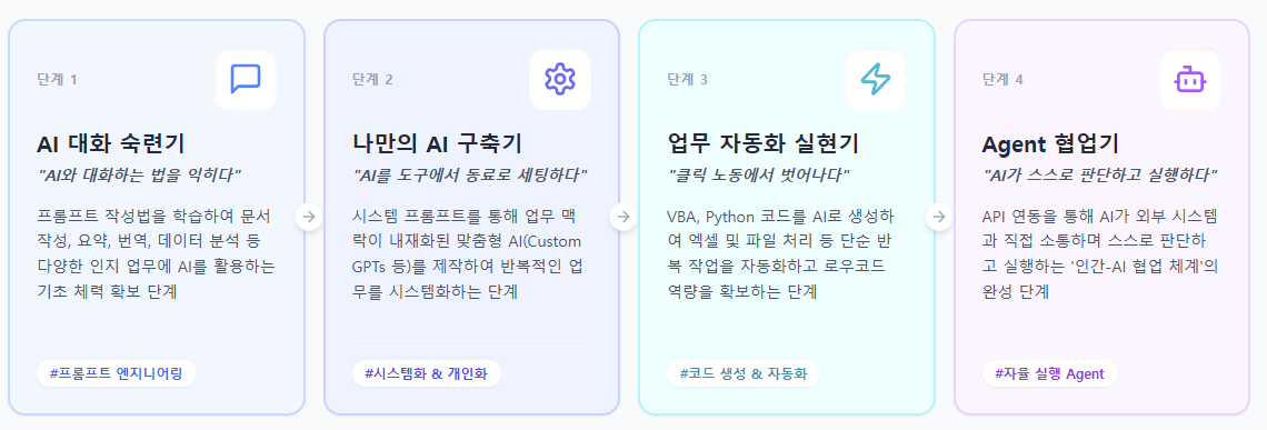 코드 생성 학습이 필요한 이유를 다시 한번 정리해 보겠습니다. 단순반복 작업이 많은 직군에게는 자동화를 통한 즉각적인 업무 효율화를 기대할 수 있습니다. 그리고 단순반복 작업이 적은 직군이라도, AX를 완성하려는 조직이라면 코드 생성은 피할 수 없는 역량입니다. AI Agent 없이 AX는 완성되지 않고, AI Agent는 코드 없이 작동하지 않기 때문입니다.