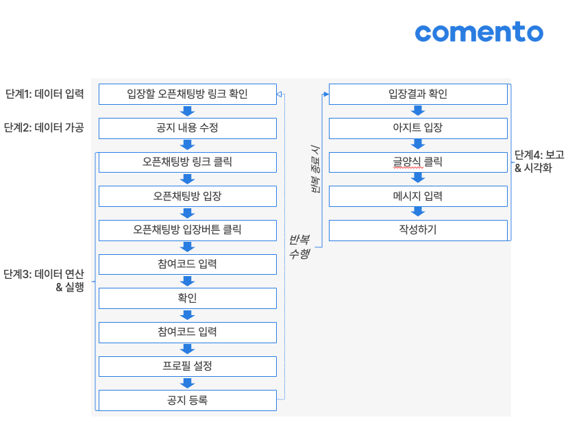 단계 1에서 목표를 정의하면 자동화하려는 업무가 구체적으로 정의됩니다. Workflow 분석은 해당 업무를 실제로 수행하는 데 필요한 가장 작은 행동 단위로 분해하는 과정입니다. 예를 들어 김붉은씨는 오픈채팅방 입장 및 공지 업무를 자동화하고자 합니다. 이 경우, 오픈채팅방 입장 및 공지 업무를 가장 작은 행동 단위로 분해하면 다음과 같습니다.